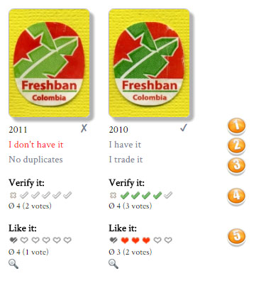 1) Clicka aquí, si deseas esta etiqueta. La etiqueta se añadirá a tu WANTLIST (lista de deseos), y tu amigo de intercambio verá esto en su REQUEST LIST (lista de lo que me piden). Encontrarás este "✘" y "✔" en la página de intercambios, cuando un coleccionista tiene duplicados para intercambiar.